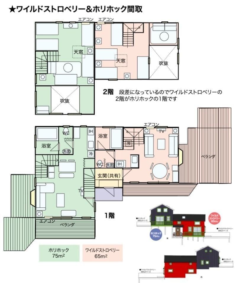 ホリホックのお部屋(青色・男の子イメージ)75m2・ワイルドストロベリーのお部屋(赤色・女の子イメージ)65m2 合わせて広々140m2 高速Wi-Fi