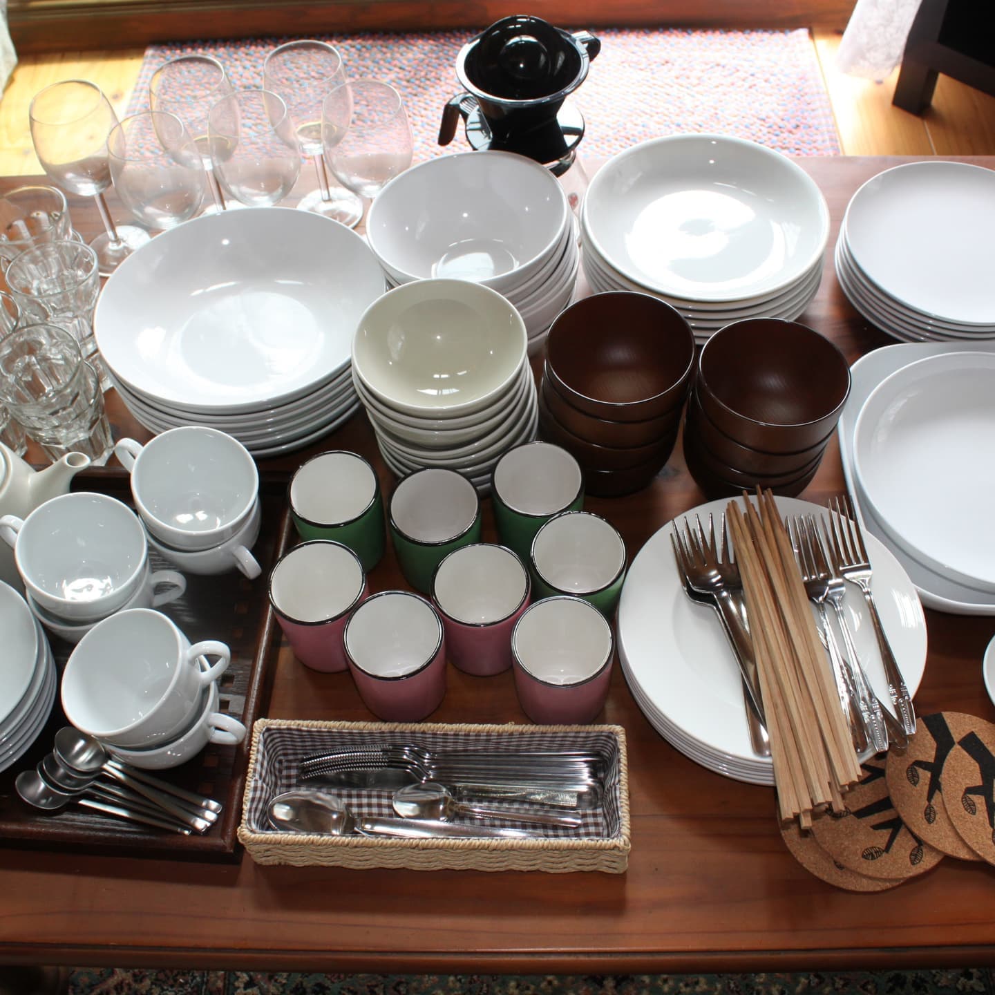 ティッシュ/クイックルワイバー/ゴミ箱/キッチンペーパー/フキン/雑巾/アルミホイル/サランラップ/洗剤各種 調理器具(フライパン、鍋等家庭で使う一般的なものは全部揃っています。) 食器(皿、コップ等家庭で使う一般的なものは全部揃っています。ワインクーラーもあります。) |